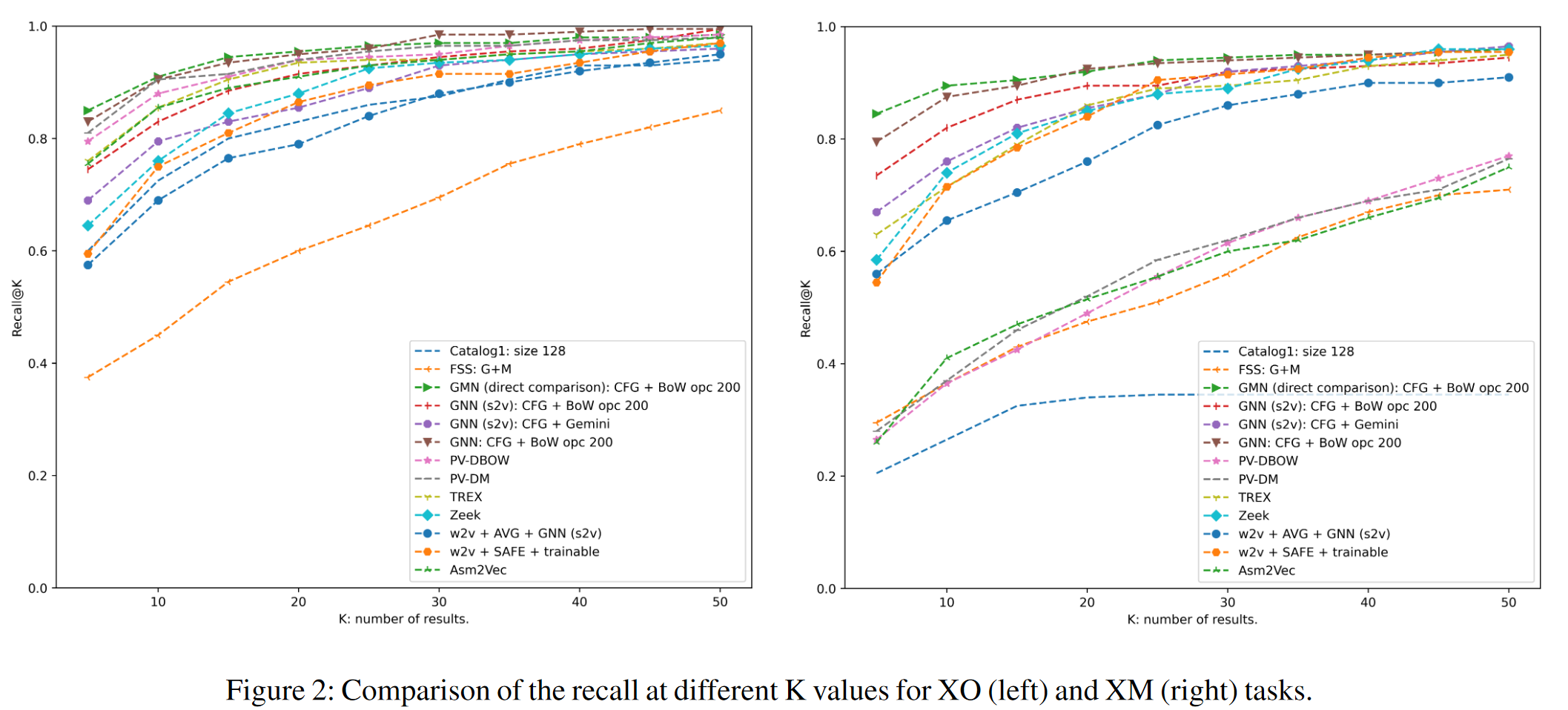 To evaluate this, the area under curve (AUC) of the receiver operating characteristics (ROC) was calculated, along with two commonly used ranking metrics, mean reciprocal rank (MRR) and recall (Recall@K) at different K thresholds. They also evaluated on a vulnerability discovery task, which covered 8 OpenSSL CVEs and selected two router firmwares, compiling 10 vulnerable functions for four architectures (x86, x64, and the two router firmwares, ARM and MIPS 32 bit). Further results and figures are located in the paper and can be referenced if desired. The provided graphs below are for Dataset-1.