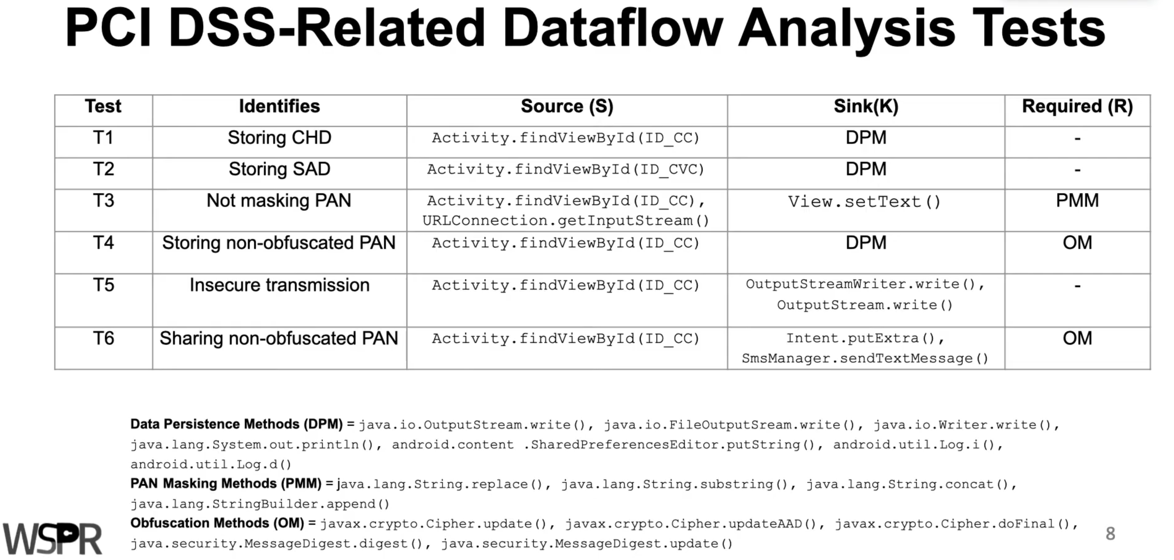Test T2 (Storing SAD): Requirement 2 states that sensitive account data (SAD) should never be written to persistent storage, including logs. Test T2 only needs to consider Activity.findViewById(int) sources that are passed resource IDs corresponding to CVC-related fields. Unlike Test T1, the existence of a data flow path directly represents a PCI DSS violation.