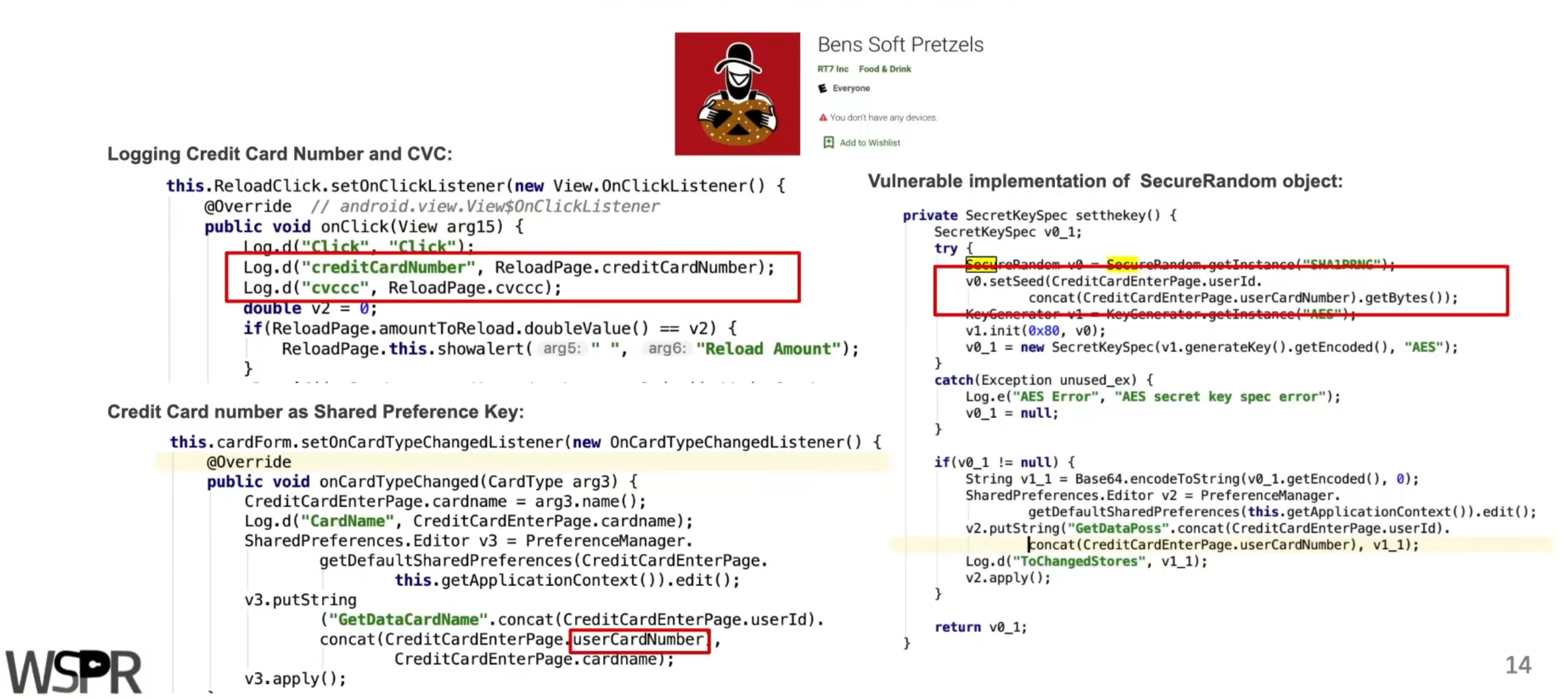Case Study 2: An application for placing online orders at a restaurant franchise is persisting credit card numbers in plaintext along with CVCs A franchise restaurant Ben’s Soft Pretzels has an application on Google Play (com.rt7mobilereward.app.benspretzel) with 10k+ downloads. Application allows users to place online orders from the restaurant and accepts credit card payments via the application. Then it stores credit card numbers without hashing or encrypting, stores CVCs, and not masks credit card numbers when displaying.