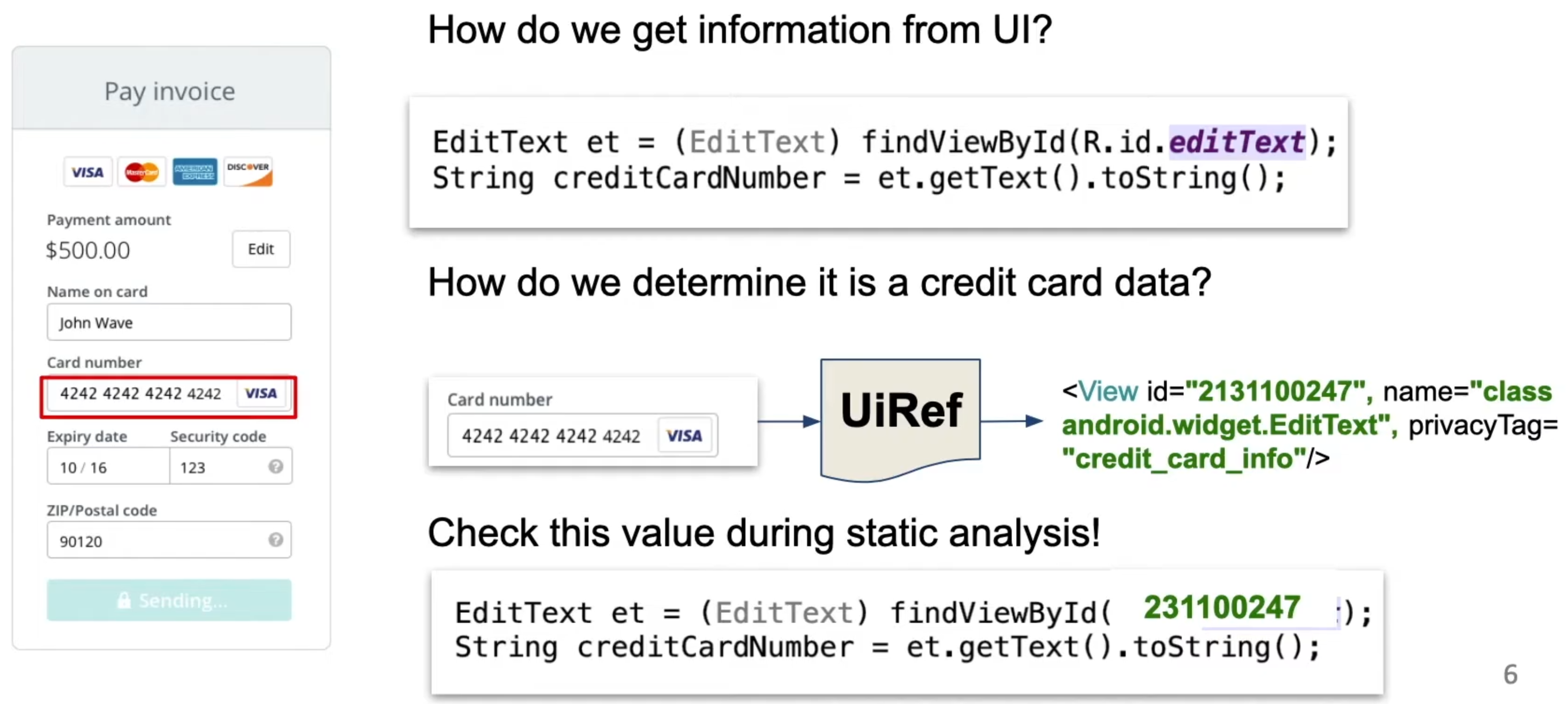 Applications access user entered text via the TextView.getText() method. To acquire a TextView object, the application calls Activity.findViewById(R.id.widget_name), where R.id.widget_name is a unique integer managed by the application’s resource R class. Therefore, Cardpliance uses Activity.findViewById(int) as a taint source. The analysis will taint the returned TextView and the subsequent string from TextView.getText(). Furthermore, since the DDG contains points-to information, the PCI DSS tests can use Amandroid’s ExplicitValueFinder.findExplicitLiteralForArgs() method to determine the integer value passed to the taint source. It then uses the resource IDs of credit card information widgets identified by UiRef to determine the types of information flowing to each sink. However, applications frequently call Activity.findViewById() to assess many different UI widgets. Therefore, simply defining it as a taint source will cause Amandroid’s taint analysis to needlessly compute taint paths for many irrelevant sources. To address this problem, Cardpliance implements a custom source and sink manager that refines the taint sources to just those Activity.findViewById(int) instructions that are passed an integer in a list precomputed by UiRef. This process involves using the PTAResult hash map while marking taint sources. This significantly reduces application analysis time. Additionally, since one of Cardpliance’s tests uses View.setText() as a taint sink, similar optimization in the custom source and sink manager is performed. In this case, the call to Activity.findViewById(int) is identified by backtracking in the DDG to the definition site of the View object. The integer resource ID is resolved similarly. If the ID is in a predefined list (defined via a heuristic for the test), the call to View.setText() is defined as a taint sink. Finally, Amandroid’s control flow analysis was patched to properly track the use of View objects obtained in OnClickListener callbacks. It occured that many applications declare the OnClickListener of a View as an anonymous inner class. In such cases, Amandroid did not capture the data flow initiated by the button click. This issue was fixed by adding a dummy edge from the point where the OnClickListener was registered to the entry point of the corresponding OnClickListener.onClick() method.