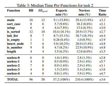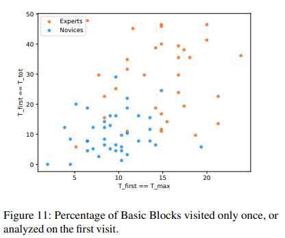 Another insight that the authors identified from the results is that experts visit 28% of the basic blocks only once. And in 80% of these cases, the visit lasted less than two seconds. This means that experts dismiss almost 22% of the basic blocks in a single glance. Whereas inexperienced users make a single visit only for 10% of the basic blocks and in total, dismiss only 7% in less that two seconds.