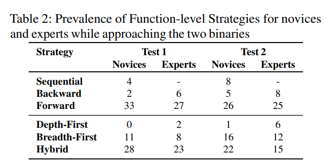 Table 3 shows that novices spend a larger amount of time analyzing functions that perform simple tasks (such as is_number which only verifies that all parameters are integer numbers) as compared to experts who quickly understand the semantics of such functions and move on to other functions of the binary.