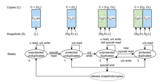 This diagram demonstrates the implementation of Midas’ multi-versioning system for memory pages. All pages are initially unprotected and unduplicated. When a kernel-level memory call is detected, such as copy-from-user or get-user, the page is marked in a protected/unduplicated state. If no other user-level thread attempts to write to this memory page before the end of the system call, the protection is released and causes no additional overhead.