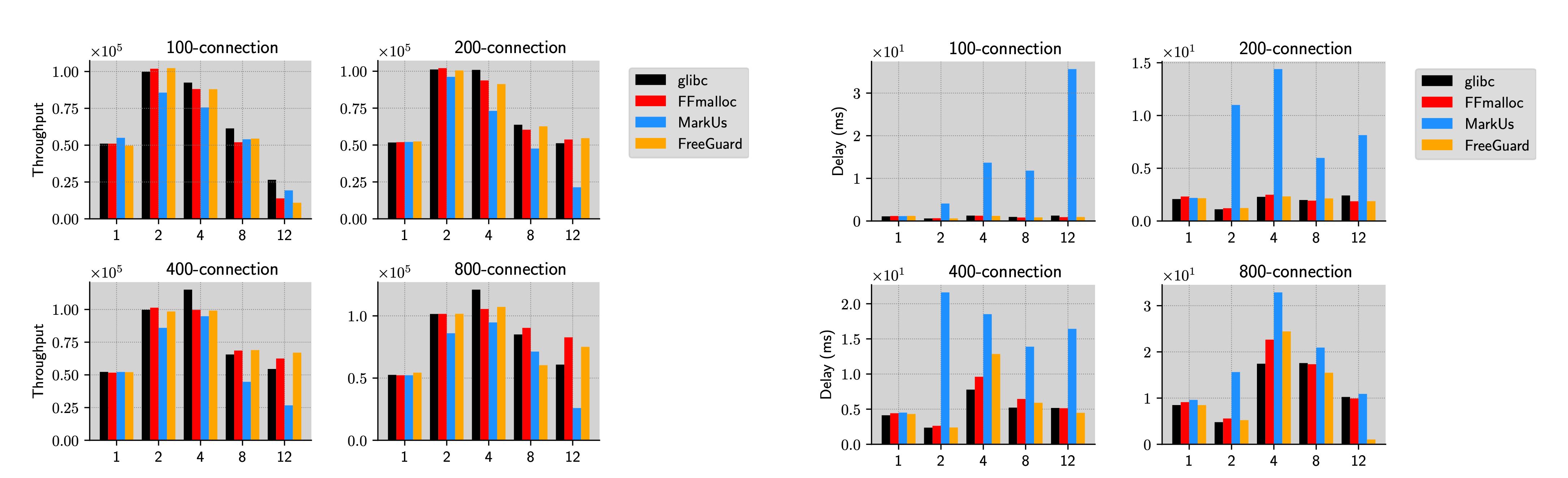FFmalloc is also compatible with multi-threaded applications. It creates one pool per thread and associates a CPU core with a distinct pool. It uses bitwise atomic and operation to achieve lockless chunk marking. It also uses locks to prevent race conditions when reading/updating the next chunk pointer.