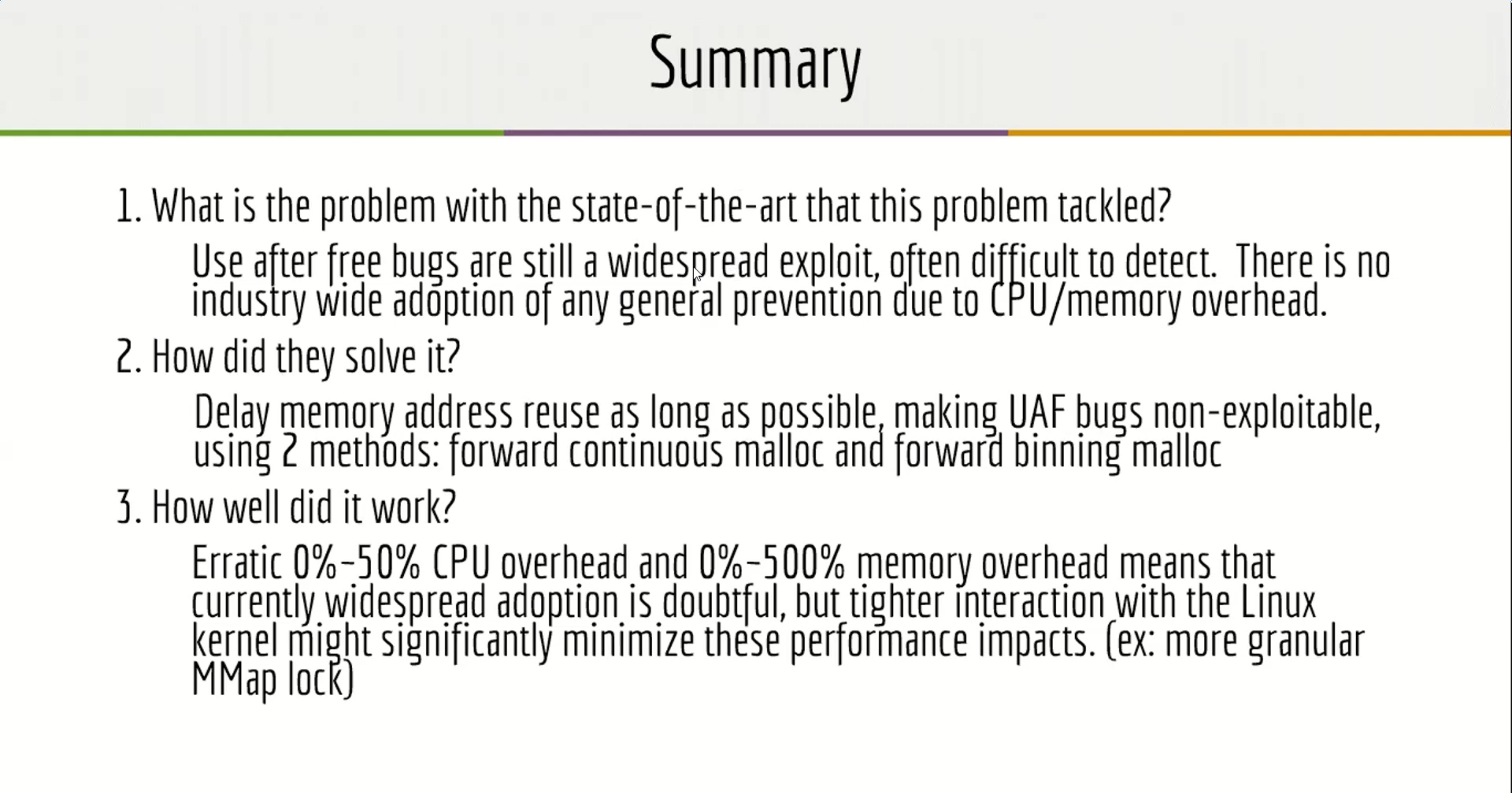 We talked about how hard it is to publish a defensive paper at a security conference during the discussion. It is very tricky to develop defensive techniques that do not break into the real world and have a minimal performance overhead. We believe that the method described in this paper can stop use-after-free attacks but does not prevent heap overflows. Also, it can have up to 50% CPU overhead in some situations, which raises concerns about actual world use. It has similarities with the heap allocator implementation in the musl libc and does not seem to introduce anything new. We think this is an experimental approach that is not usable in the real world, but it is the right step, and more research in this area will eventually yield fruit.